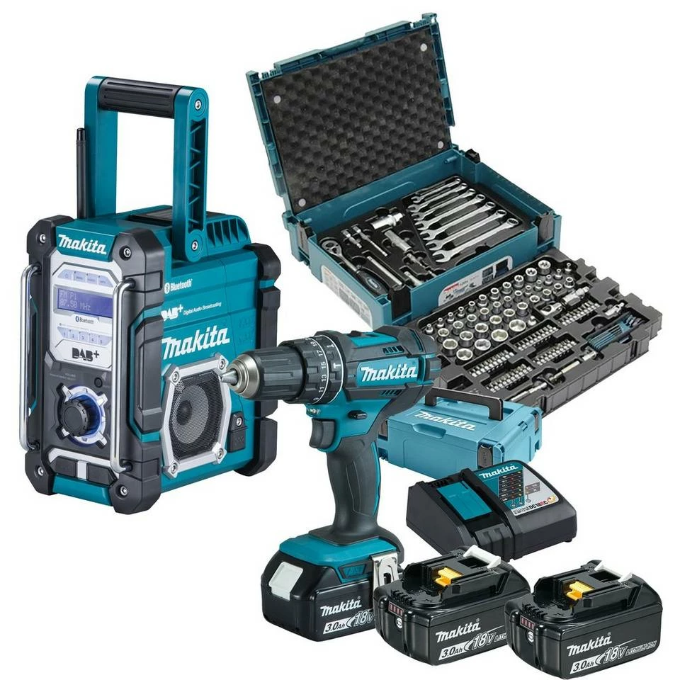 Akku-Schlagbohrschrauber 18V DHP482RF3J inkl.3 3,0Ah Akkus,1 Ladegerät+ MAKPAK mit Akku-Baustellenradio 7,2-18V mit DAB+ u. Bluetooth DMR112 und 120 tlg. Werkzeugset , Tools für Profis und Heimwerker.