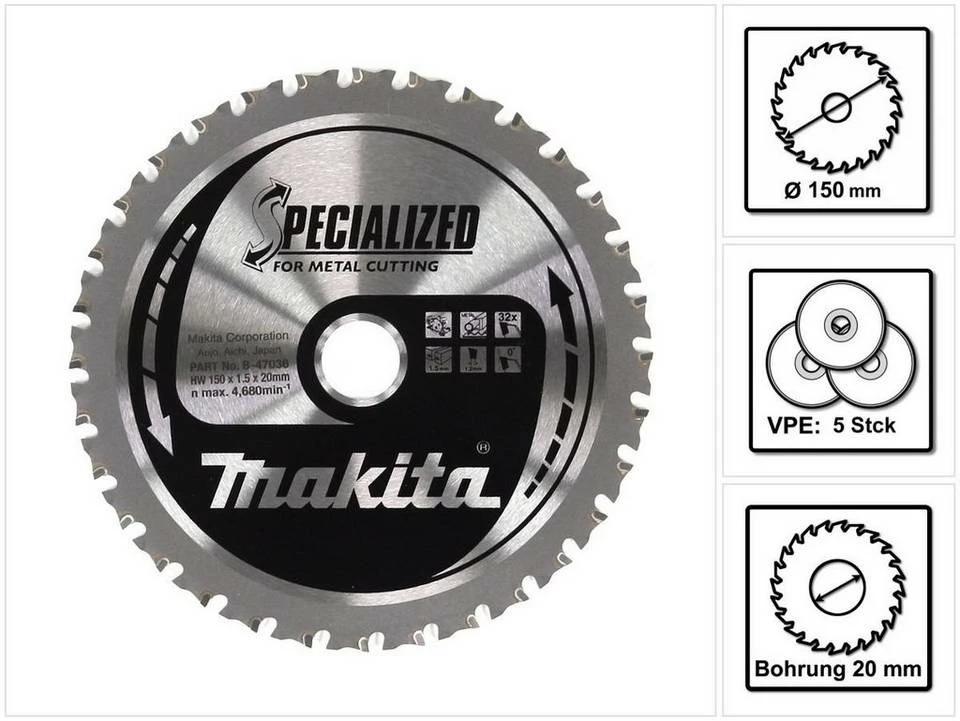 - Anzahl: 5Typ: HM – HartmetallDurchmesser: 150 mmLochdurchmesser / Bohrung: 20 mmSchneidbreite: 1,5